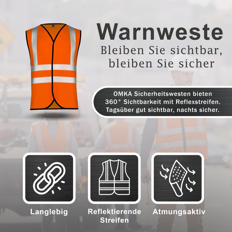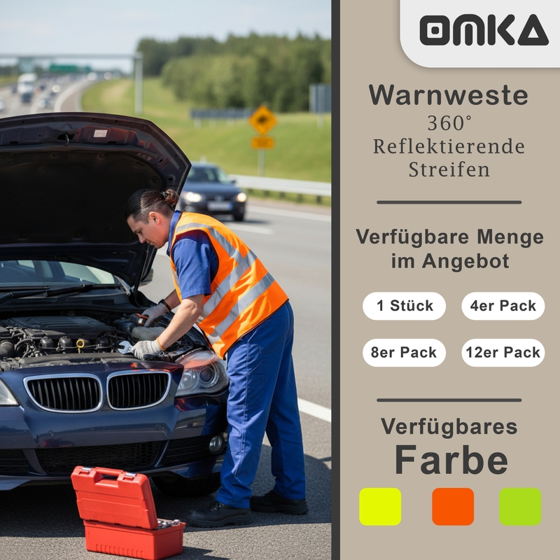 Erhöhen Sie Ihre Sicherheit mit dem Omka Premium-Pack mit 4 Warnwesten. Diese für ultimative Sichtbarkeit konzipierten Westen verfügen über leuchtende Neonfarben und reflektierende Streifen, die sicherstellen, dass Sie in jeder Situation auffallen. Der elegante V-Ausschnitt und das ärmellose Design sorgen für Komfort und Bewegungsfreiheit und machen sie ideal für Notfälle und andere risikoreiche Szenarien. Diese Pannenwesten sind in drei auffälligen Neonfarben erhältlich und bestehen aus hochwertigen Materialien, die eine lange Lebensdauer garantieren. Sie sind sowohl stilvoll als auch funktionell. Kaufen Sie jetzt online und sichern Sie sich Ihr Set dieser unverzichtbaren Sicherheitswesten und schützen Sie sich mit erstklassiger Ausrüstung, die Sichtbarkeit, Eleganz und hervorragende Qualität vereint.