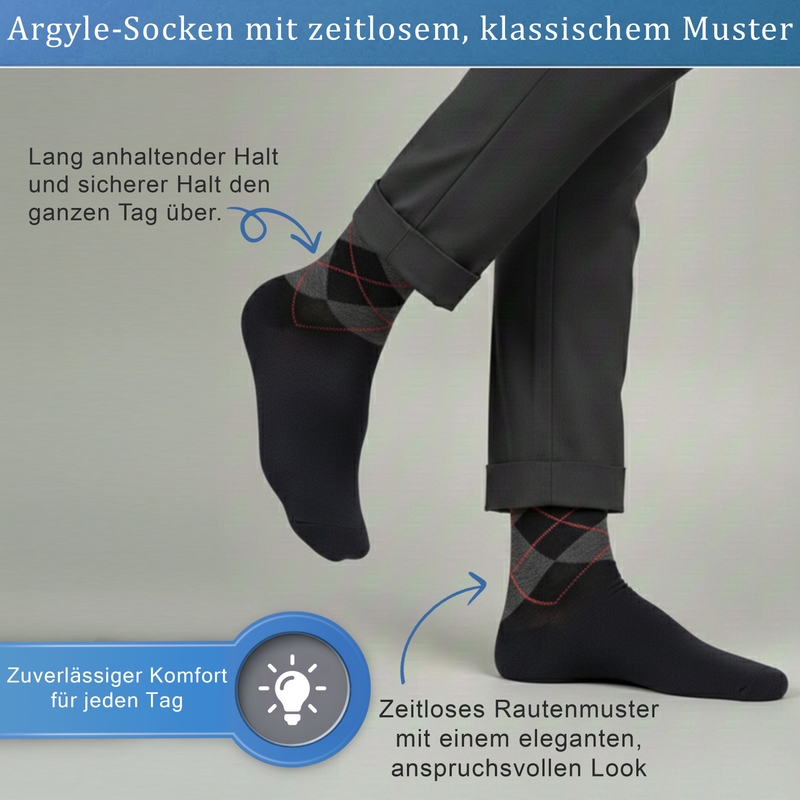 Herren Argyle Dress Socks sind ein stilvolles Must-have für moderne Männer, die Wert auf Eleganz und Komfort legen. Dieses 6er-Pack Argyle Dress Socks für Herren überzeugt mit einem zeitlosen Diamantmuster in klassischem Blau/Schwarz und eignet sich ideal als Business- und formelle Herrensocken für Büro, Arbeit und besondere Anlässe. Als klassische Herrensocken ergänzen sie Anzüge und elegante Schuhe perfekt und verleihen jedem Outfit eine professionelle, gepflegte Ausstrahlung. Gefertigt aus 80 % Baumwolle, 18 % Polyester und 2 % Elasthan, unterstützen diese atmungsaktiven Baumwoll-Dresssocken die natürliche Fußphysiologie durch optimale Luftzirkulation, Feuchtigkeitsregulierung und flexible Passform. Die weiche Baumwolle reduziert Reibung und Druckstellen, während Elasthan für sicheren Halt und ganztägigen Tragekomfort sorgt. Diese bequemen Herrensocken sind für alle Jahreszeiten geeignet und ideal für lange Arbeitstage. Argyle Dress Socks jetzt online kaufen und Ihre Business-Garderobe aufwerten.