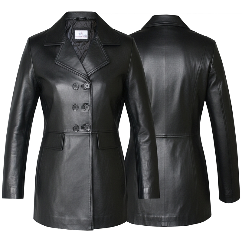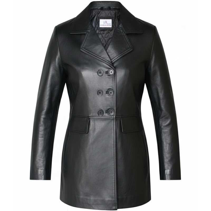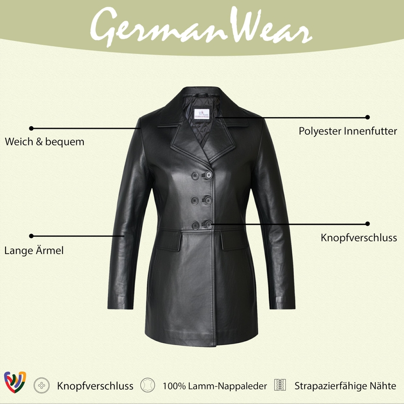 Verbessern Sie Ihren Stil mit einem Damen Ledermantel, gefertigt aus feinstem Lammnappa-Leder in klassischer schwarzer Farbe. Der exzellente Trenchcoat verbindet Anmut mit Komfort und bietet mit seinem weichen Material ein hervorragendes Tragegefühl. Der Mantel verfügt über eine praktische Innentasche auf Bauchhöhe auf der rechten Seite, in der Sie Ihre wichtigsten Utensilien diskret verstauen können. Der von German Wear entworfene und produzierte Mantel ist mit seinem schlichten und raffinierten Design ein absoluter Blickfang. Das Außenmaterial ist komplett aus luxuriösem Leder gefertigt, während das Innenfutter aus hochwertigem Polyester besteht, was für Langlebigkeit und Komfort sorgt. Der Ledermantel ist eine vielseitige Ergänzung Ihrer Garderobe, ganz gleich, ob Sie sich für einen Abend herausputzen oder Ihrem Alltagslook einen Hauch von Klasse verleihen möchten. Genießen Sie die kostenlose Lieferung am nächsten Werktag und den Komfort einer kostenlosen Rücksendung weltweit. Investieren Sie in einen Mantel, der erstklassige Qualität mit zeitlosem Stil kombiniert und somit ein Muss für jede modebewusste Frau ist.