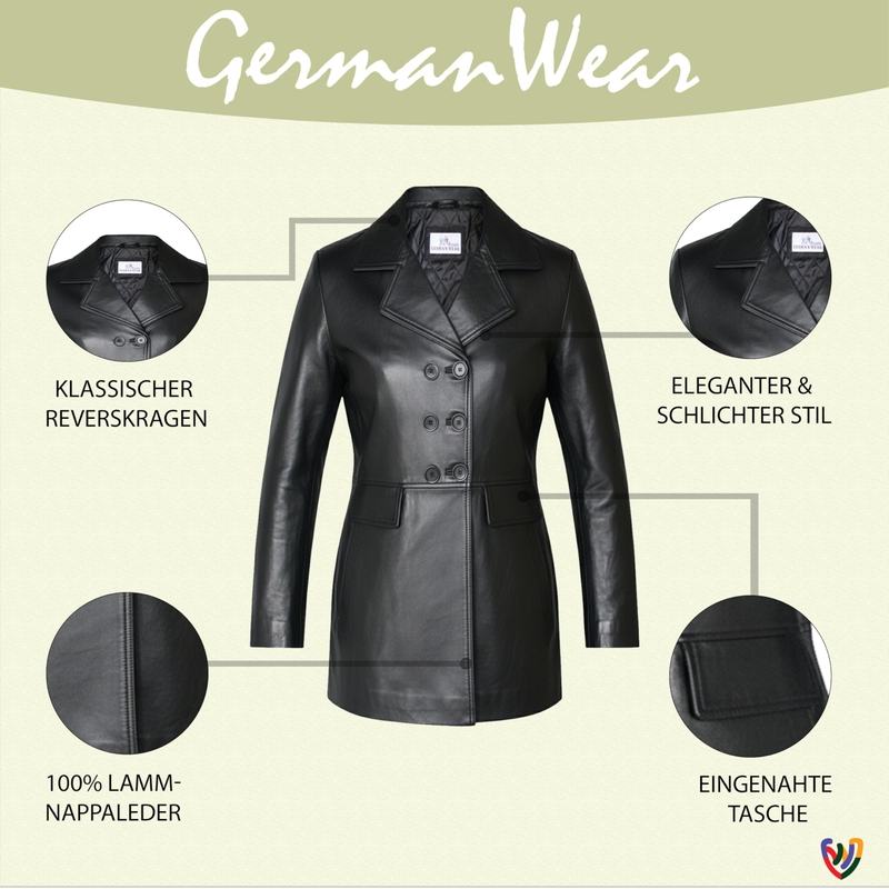 Beschreibung und technische detials von Damen Ledermantel Jacke aus Lamm Nappa Leder Schwarz