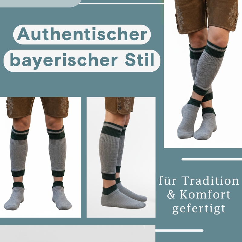 Erleben Sie den Charme traditioneller bayerischer Loferl-Socken – ein klassisches 2-teiliges Set in Grau und Grün mit elegantem Zopfmuster. Diese Socken bestehen aus 80 % Merinowolle und 20 % Polyamid und verbinden Weichheit, Atmungsaktivität und Strapazierfähigkeit für maximalen Komfort. Die kurzen Socken und der Wadenbereich sind so gestaltet, dass sie perfekt zu Lederhosen oder jeder anderen bayerischen Tracht passen, was sie zur idealen Wahl für Oktoberfest-Loferl-Socken oder festliche Trachtenoutfits macht. Der stilvolle umgeschlagene Bund und das gemusterte Design verleihen Ihrem Look einen authentischen Touch. Mit einer verstärkten Ferse und Spitze sind diese strapazierfähigen Oktoberfest-Socken für langlebigen Tragekomfort ausgelegt und gewährleisten sowohl Komfort als auch Strapazierfähigkeit. Der ca. 40 cm lange Wadenbereich bietet hervorragenden Schutz und ist gleichzeitig atmungsaktiv. Ob Sie elegante bayerische Strümpfe, bequeme Alltagssocken oder die besten Loferl-Socken für das Oktoberfest suchen, dieses Set ist ein unverzichtbares Accessoire für Männer, die sowohl Tradition als auch Qualität schätzen. Kaufen Sie jetzt online ein und bestellen Sie, um Ihr authentisches bayerisches Outfit zu vervollständigen.