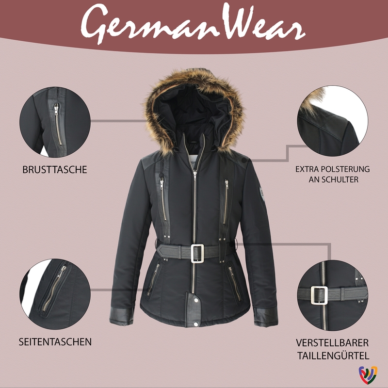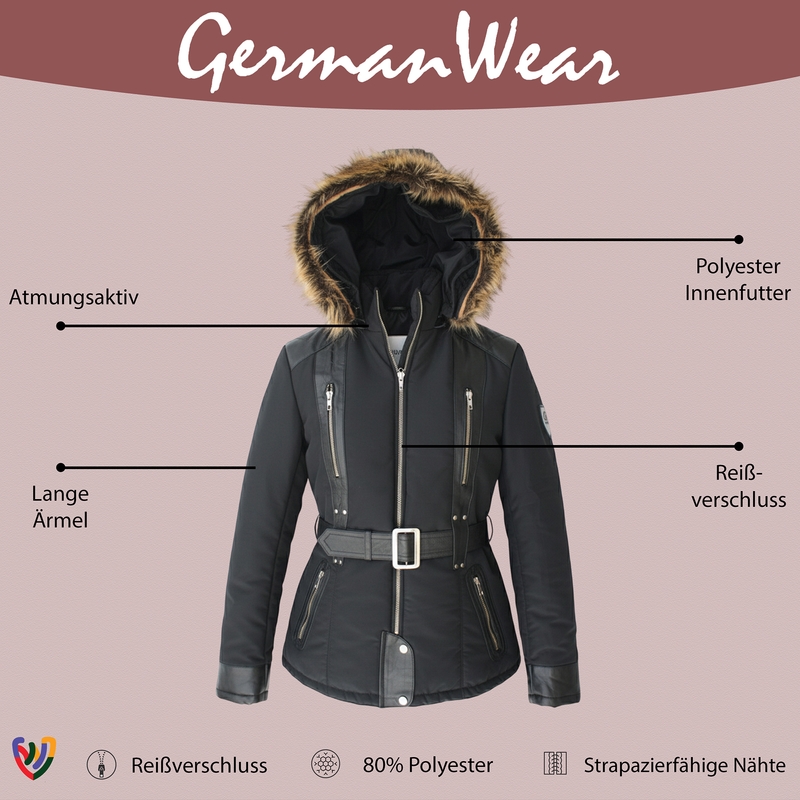 German Wear, Damen Jacke aus Textilien mit Lammnappa Streifen Schwarz Trend 421J Black Kurz
