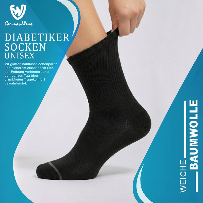 Unterstützen Sie die Gesundheit Ihrer Füße mit unserem 3er-Pack Diabetikersocken, entwickelt für maximalen Komfort und Schutz. Hergestellt aus 80% Baumwolle, 18% Polyester und 2% Elasthan, sind diese unisex Socken weich, atmungsaktiv und gepolstert, um Druck auf empfindliche Füße zu reduzieren. Der nicht einschnürende Bund fördert die Durchblutung und hilft, das Risiko von Nervenschäden, schlechter Durchblutung und Fußgeschwüren zu minimieren. Ideal für den täglichen Gebrauch bieten diese Socken ganztägigen Komfort, während sie Ihre Füße trocken und gesund halten. Perfekt als Socken für Diabetiker, sorgt unser gepolstertes und atmungsaktives Design für eine sanfte Passform ohne Einschnürung. Für alle Jahreszeiten geeignet, bieten diese baumwollreichen Socken für empfindliche Füße weiche Unterstützung und langlebigen Komfort für den Alltag. Jetzt Diabetikersocken online kaufen mit kostenlosem Versand und genießen Sie zuverlässigen Komfort, Schutz und Pflege für Ihre Füße—Jetzt online bestellen und den Unterschied erleben!