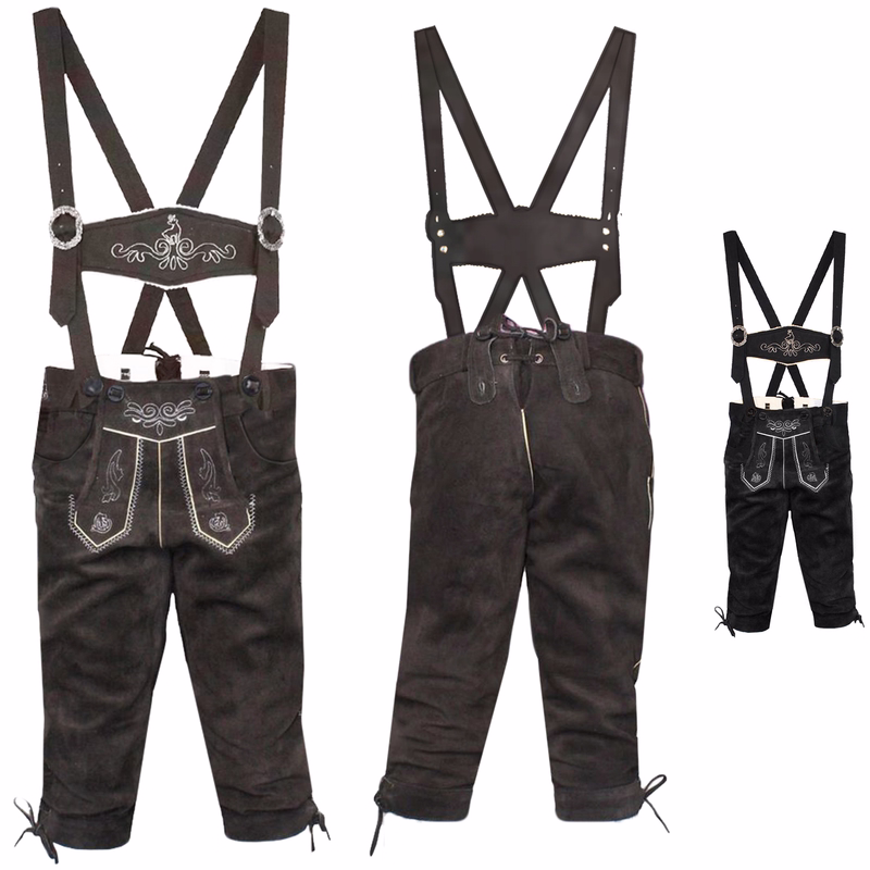 Traditionelle Lederhosen für Jungen mit Hosenträgern – das perfekte Kinder-Oktoberfest-Outfit und ein zeitloses Stück authentischer bayerischer Tracht. Gefertigt aus 100 % hochwertigem Rindsveloursleder sind diese knielangen Lederhosen weich, strapazierfähig und angenehm auf der Haut. Wunderschöne beige Stickereien und Paspeln unterstreichen die traditionelle deutsche Handwerkskunst, während eine seitliche Messertasche für authentische Details sorgt. Mit sicherem Knopfverschluss und in elegantem Dunkelbraun/Schwarz bieten diese traditionellen Jungenhosen sowohl Stil als auch Langlebigkeit für festliche Anlässe.