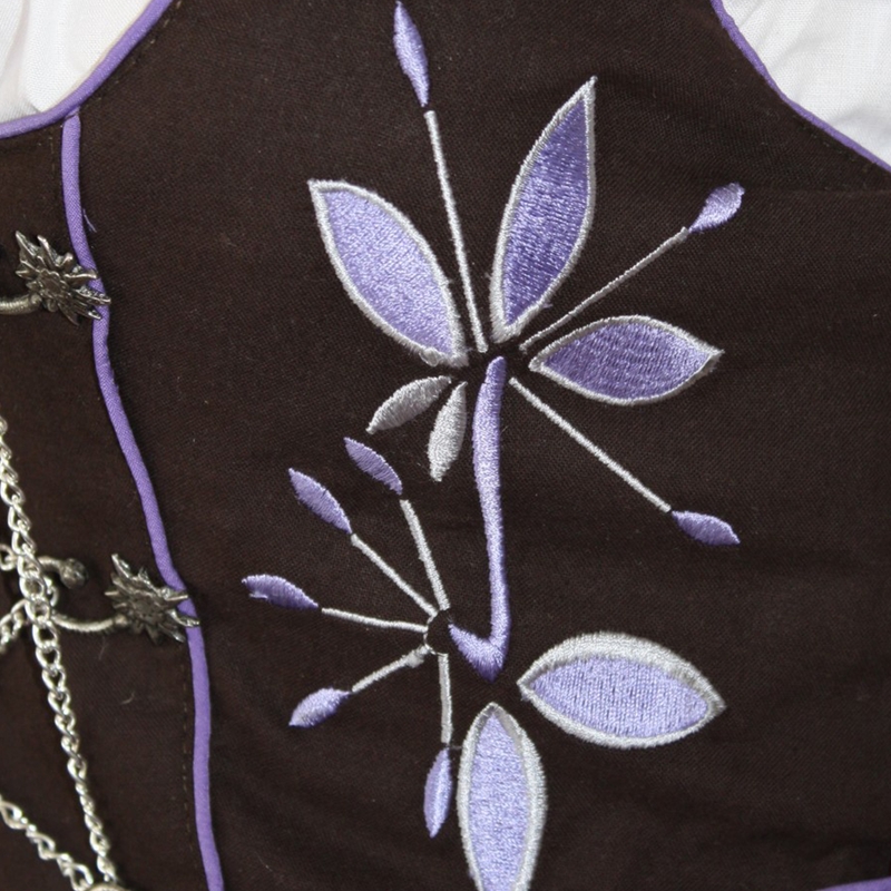 3-piece midi dirndl (knee-length) with matching apron in color: black/brown with matching lilac apron and white bustier blouse