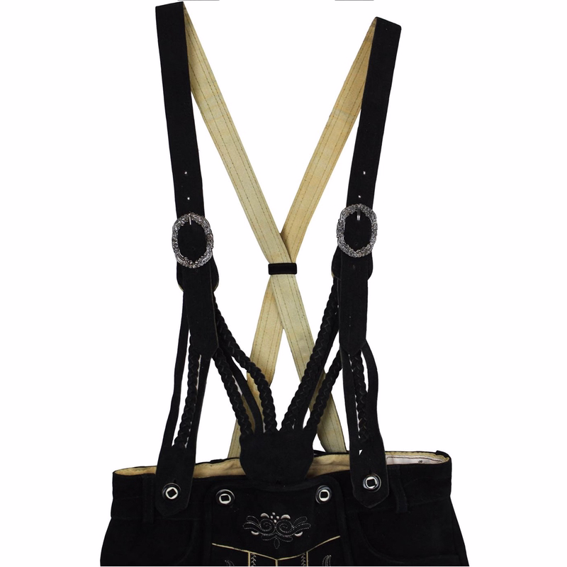 A leather suspenders made of 100% genuine soft goat suede with handcrafted bavarian emblem available.