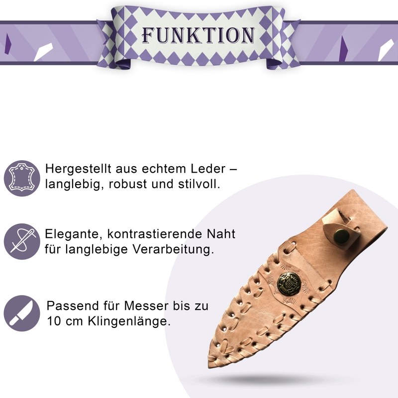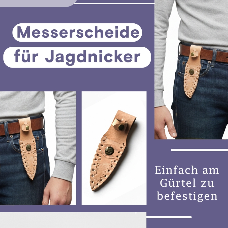 Protect and carry your knives with our beige leather knife sheath, designed for hunting knives, pocket knives, and traditional blades. Made from genuine leather, this sheath is extremely robust and tear-resistant, featuring a closure strap with snap fastener to securely hold your knife. Its tapered end ensures a perfect fit, while the classic design with additional leather cords and a black/gold Bavarian emblem adds elegance and style. Ideal as part of your hunting knives accessories or outdoor knife gear, this sheath includes a belt loop for easy attachment, making it perfect for daily use or outdoor adventures. Compact yet functional, it fits blades up to 10 cm, with dimensions of approx. 22 cm x 7 cm. Buy leather knife sheath online today to combine durability, practicality, and traditional craftsmanship. Shop now and protect your knives with style!