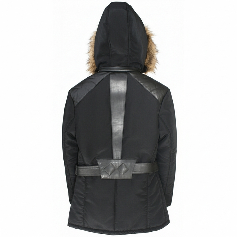 Ladies jacket made from Polyester with leather stripes. made of finest polyester & lambskin stripes.
