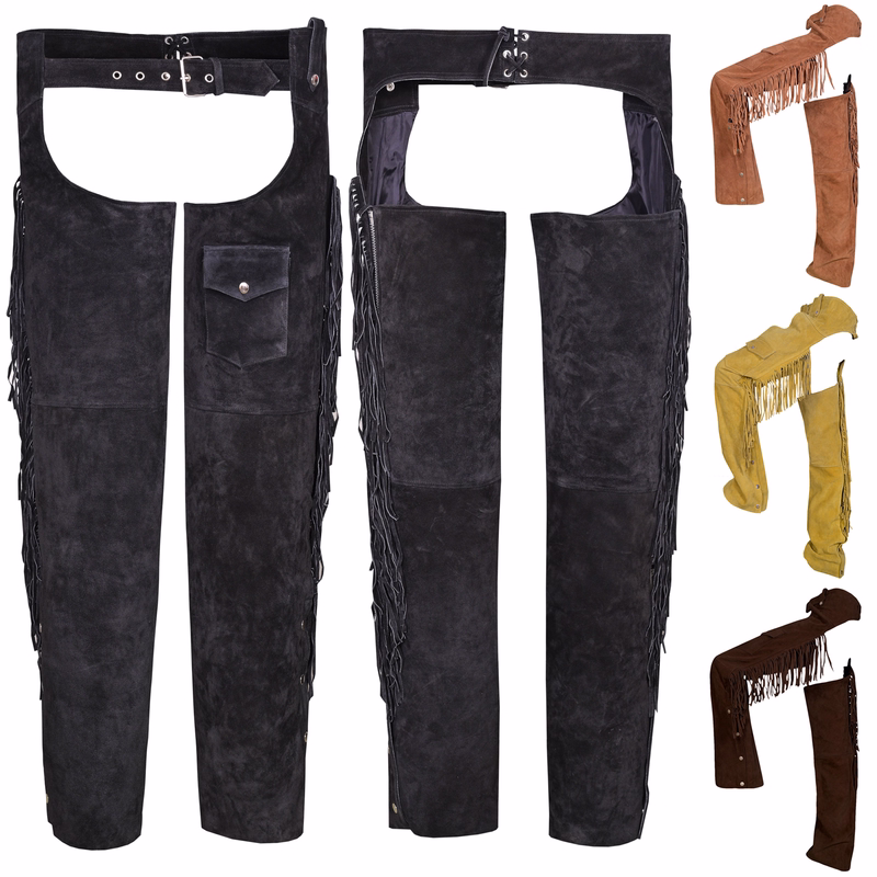 Perfect for Western riding, club costumes, carnival events, or everyday rider wear, these chaps include a small left-leg pocket for essentials. Designed and manufactured by German Wear, they offer a timeless cowboy look while providing exceptional durability and comfort. Whether paired with suede leather pants or worn over your favorite riding gear, these chaps are a must-have for any cowboy or Western enthusiast looking to make a statement.