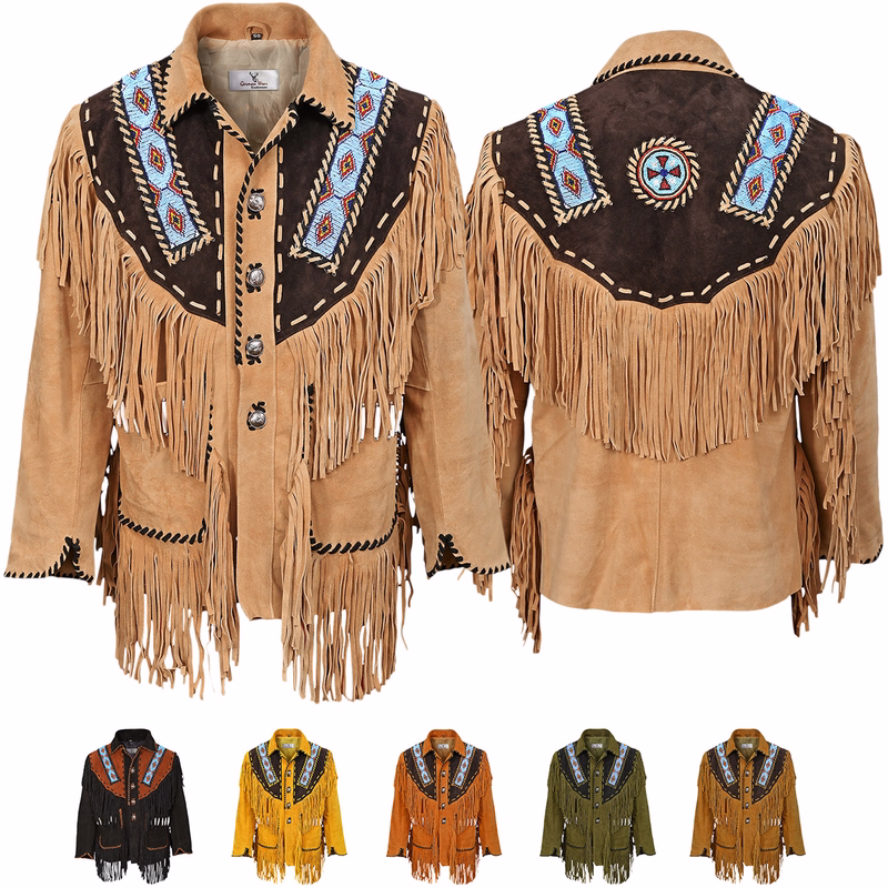 Elevate your wardrobe with our Ochre/Black Western Rider Leather Jacket. This eye-catching piece combines the rustic charm of Western style with the vibrant flair of Indian design. Crafted from 100% suede, it features long sleeves and a classic Kent collar that offers a timeless silhouette. The jacket's standout details include ample fringed shoulders embellished with plastic rods and white beads, adding a unique touch of both Western and Indian influences.