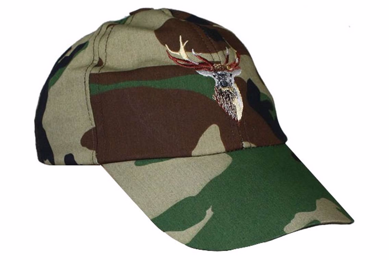 A textile hunting cap with military pattern and stitchery.