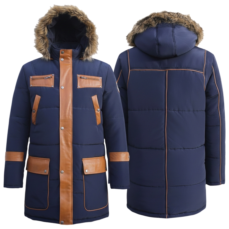 Experience a perfect blend of style& functionality with Men's Down Jacket featuring sewn-on leather stripes. The premium winter jacket is designed to keep you warm &stylish throughout the cold season. Crafted from 80% polyester and 20% leather, it offers durability &a sleek look. The woven faux fur hood is divisible, providing versatility for different weather conditions. The classic hooded jacket comes in elegant brown &blue colors, with matching brown inner lining. It features a mixture of horn buttons &a zipper for secure closure, while leather strips cover the zippers of the eloquently designed front pockets at the bottom. 1 designed for mobile devices with a headphone slot, &another with a zipper for securing your wallet or ID papers. Designed and manufactured by German Wear, jacket combines high-quality materials with expert craftsmanship. The faux fur, made of polymer fibers, is easy to dry. Enjoy free next-business-day delivery &the comfort of free returns worldwide