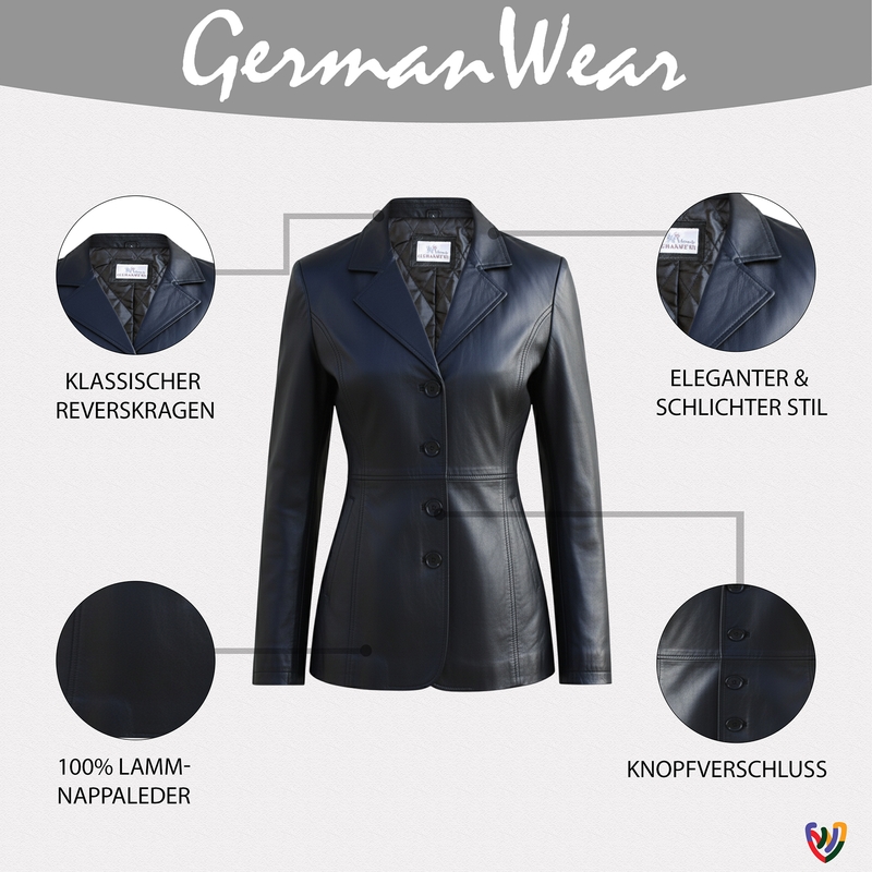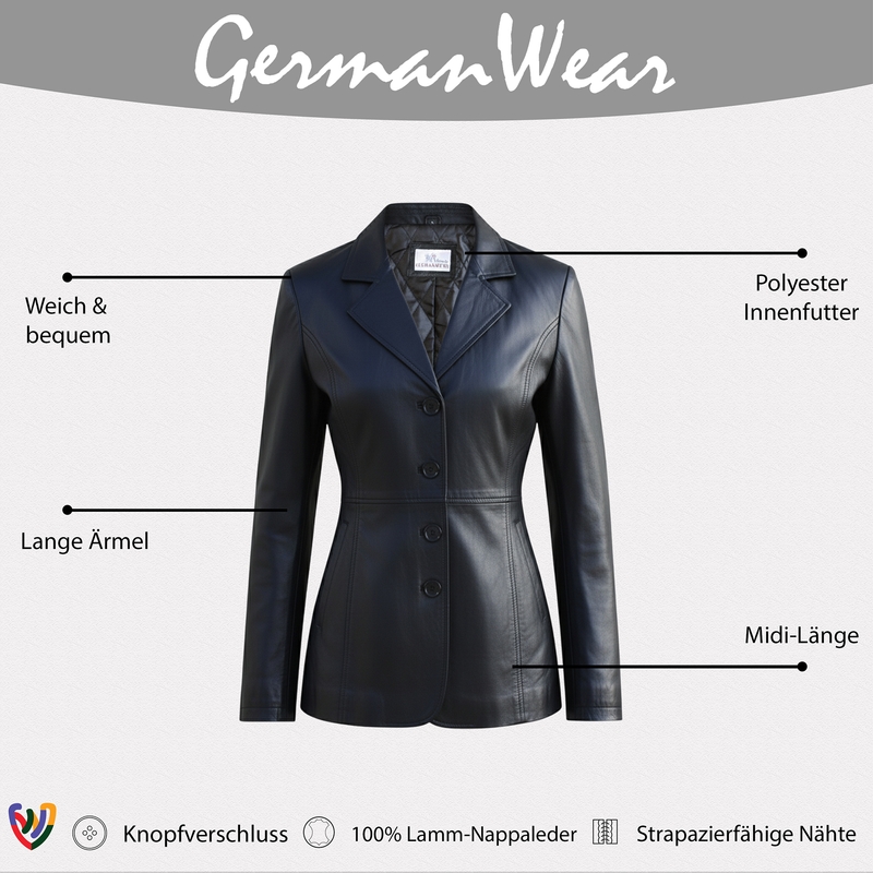 Beschreibung und technische detials von Damen Ledermantel Jacke aus Lamm Nappa Leder Schwarz