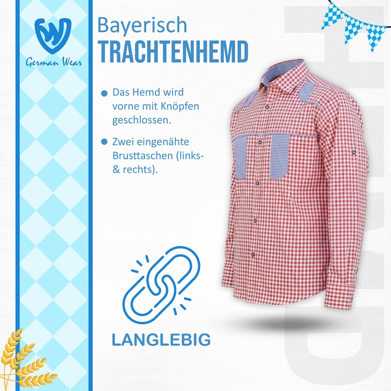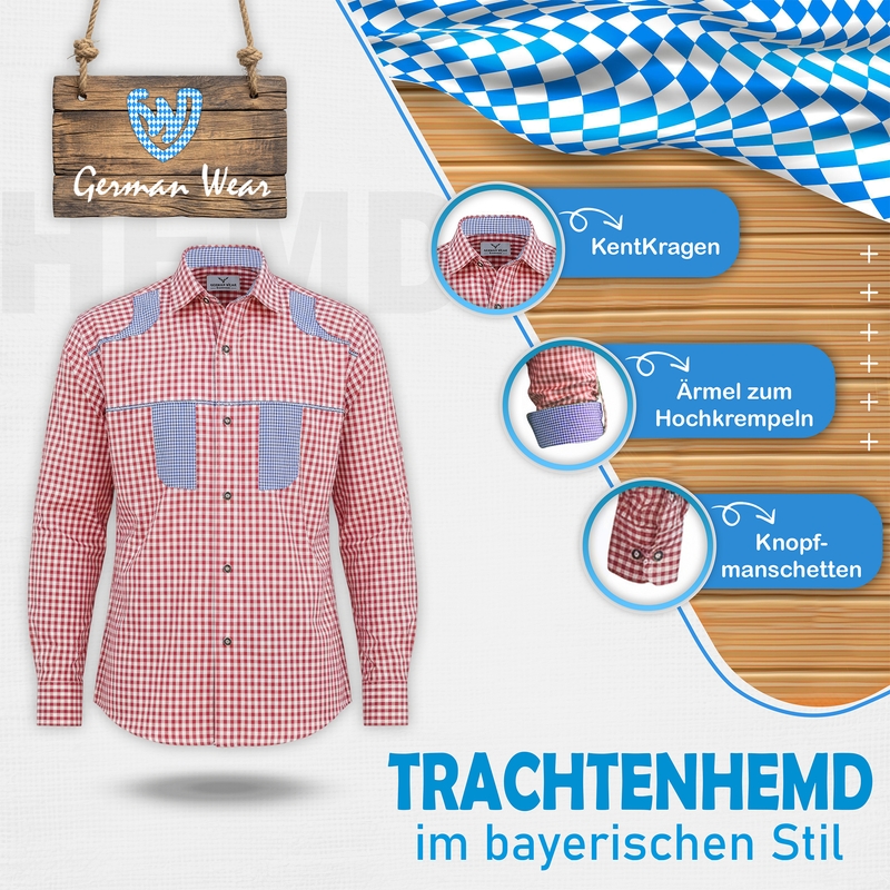 Erleben Sie echte bayerische Tradition mit diesem hochwertigen Herren Trachtenhemd von German Wear. Gefertigt aus 100 % atmungsaktiver Baumwolle bietet das weiche Material ganztägigen Tragekomfort – ideal für Oktoberfest, Karneval oder traditionelle Volksfeste. Das klassische rot-blau karierte Design passt perfekt zu Lederhosen und verleiht jedem Anlass einen authentischen Look. Mit Knopfleiste, verstellbaren Ärmeln und praktischer Brusttasche verbindet dieses Hemd Stil mit Funktionalität. Dieses langärmelige Trachtenhemd überzeugt mit gekrempelten Ärmeln, festem Kragen und hochwertiger Verarbeitung. Ob für ein deutsches Fest, als Kostümhemd oder als bequemes Freizeithemd – dieses bayerische Hemd bietet zeitlose Eleganz und hohen Tragekomfort. Jetzt kaufen und traditionelle Mode neu erleben – jetzt bestellen und perfekt gekleidet auftreten!