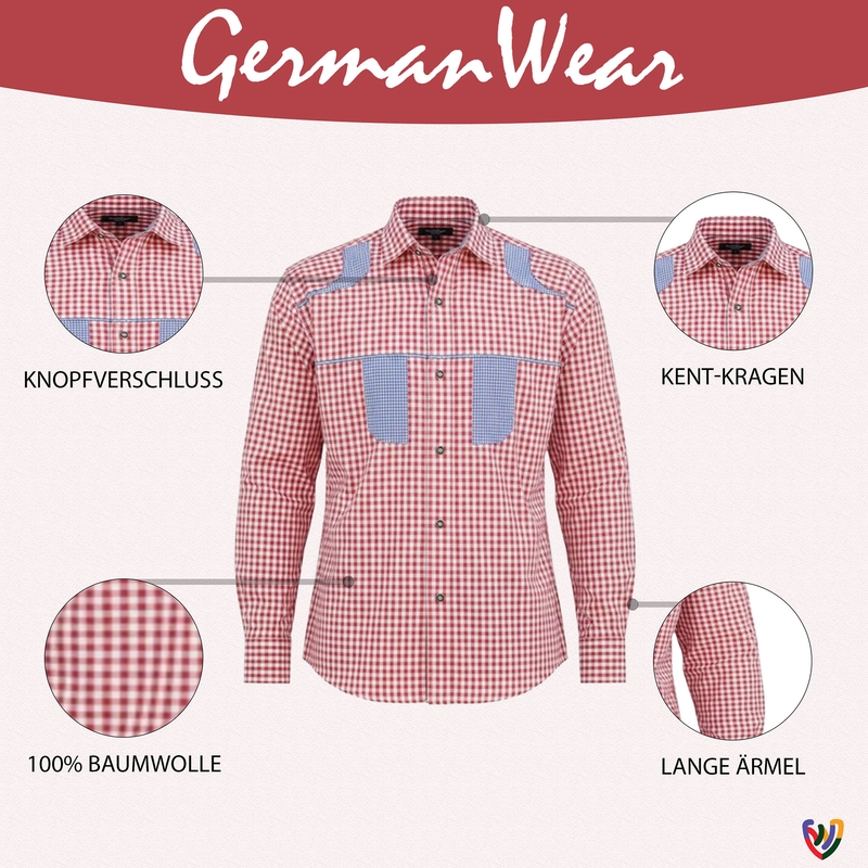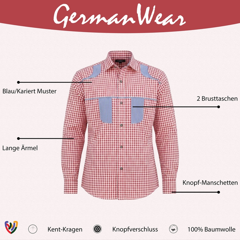 Erleben Sie echte bayerische Tradition mit diesem hochwertigen Herren Trachtenhemd von German Wear. Gefertigt aus 100 % atmungsaktiver Baumwolle bietet das weiche Material ganztägigen Tragekomfort – ideal für Oktoberfest, Karneval oder traditionelle Volksfeste. Das klassische rot-blau karierte Design passt perfekt zu Lederhosen und verleiht jedem Anlass einen authentischen Look. Mit Knopfleiste, verstellbaren Ärmeln und praktischer Brusttasche verbindet dieses Hemd Stil mit Funktionalität. Dieses langärmelige Trachtenhemd überzeugt mit gekrempelten Ärmeln, festem Kragen und hochwertiger Verarbeitung. Ob für ein deutsches Fest, als Kostümhemd oder als bequemes Freizeithemd – dieses bayerische Hemd bietet zeitlose Eleganz und hohen Tragekomfort. Jetzt kaufen und traditionelle Mode neu erleben – jetzt bestellen und perfekt gekleidet auftreten!