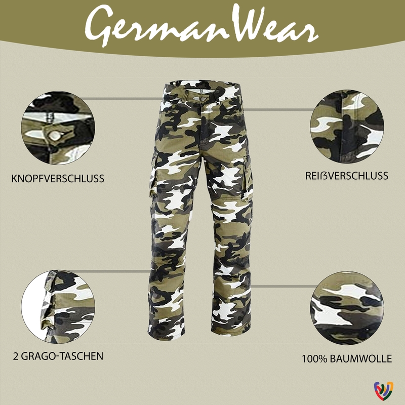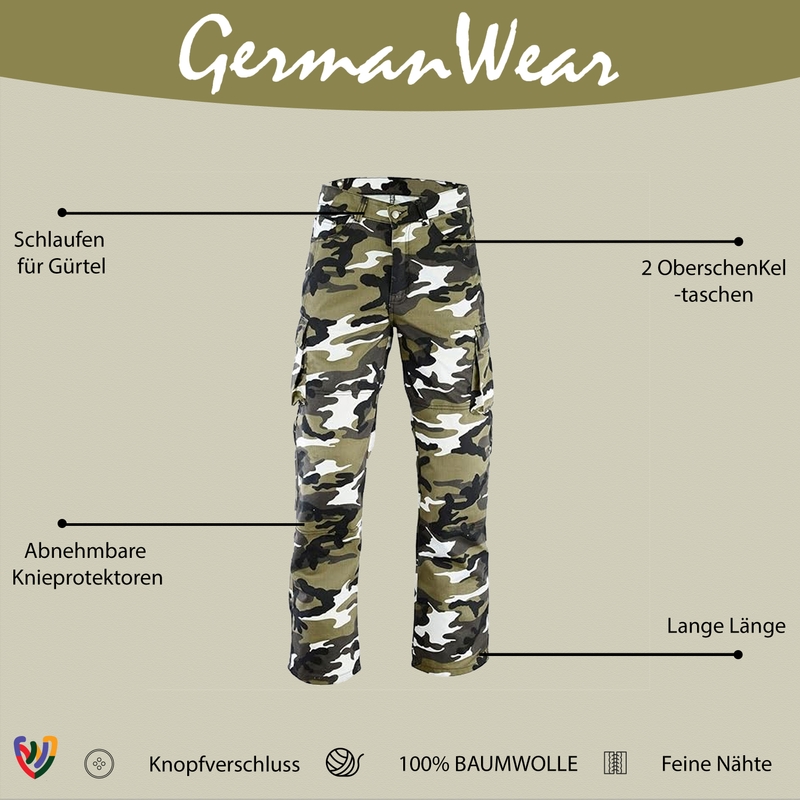 Rutsch und brandfeste Cargo Hose, Motorradhose mit herausnehmbaren Protektoren 280g/m2, Schwarz, Camo, Grün/Camo, Rot/Camo