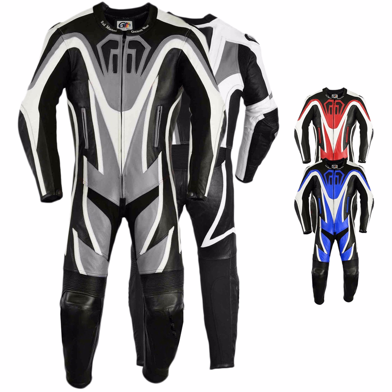 Einteiliger Motorradlederanzug aus echtem Kalbsleder in elegantem Schwarz, raffiniertem Grau und klassischem Weiß. Die windabweisende und atmungsaktive Innenmembran sorgt für Komfort und Belüftung auf der Straße. Der integrierte Buckel auf dem Rücken bietet zusätzlichen Schutz vor Stößen und sorgt gleichzeitig für einen stromlinienförmigen Look.