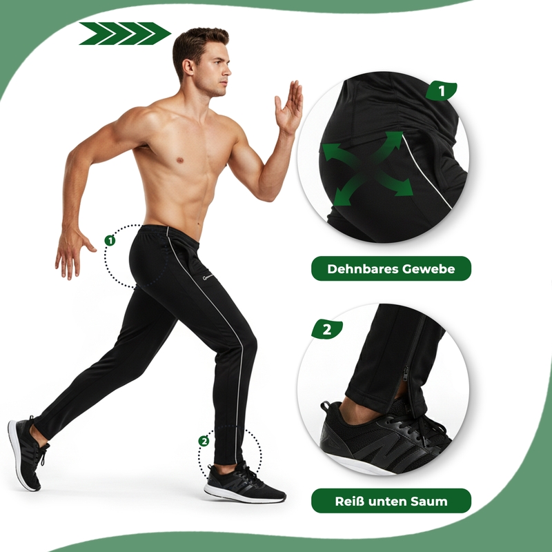 Verbessern Sie Ihr Training mit den STRIKER Herren-Trainingshosen, die sich perfekt für das Fitnessstudio, Laufen und Fußball eignen. Diese schwarzen Trainingshosen bestehen aus atmungsaktivem, flexiblem und strapazierfähigem Polyestergewebe, das maximalen Komfort und Bewegungsfreiheit bietet. Das perforierte Material sorgt für Atmungsaktivität, während das doppellagige Design effektiv Schweiß aufnimmt. Egal, ob Sie Gewichte heben, laufen oder Fußball spielen, diese Hosen unterstützen Sie dabei, Ihre beste Leistung ohne Einschränkungen zu erbringen. Das stylische schwarze Design bietet Reißverschlusstaschen für zusätzlichen Komfort und Sicherheit während des Trainings. Diese STRIKER-Hosen sind sowohl für Indoor- als auch Outdoor-Trainingseinheiten optimiert und somit vielseitig für verschiedene Sportarten einsetzbar. Die Beinabschlüsse mit verdeckten Reißverschlüssen bieten eine sichere Passform und gleichzeitig Bewegungsfreiheit. In verschiedenen Größen erhältlich, empfehlen wir, die größere Größe zu wählen, wenn Sie zwischen zwei Größen liegen. Maschinenwaschbar und mit einfachen Pflegehinweisen sind diese strapazierfähigen Hosen ein Muss für jeden Athleten. Kaufen Sie jetzt die besten komfortablen und funktionalen Trainingshosen für Herren!