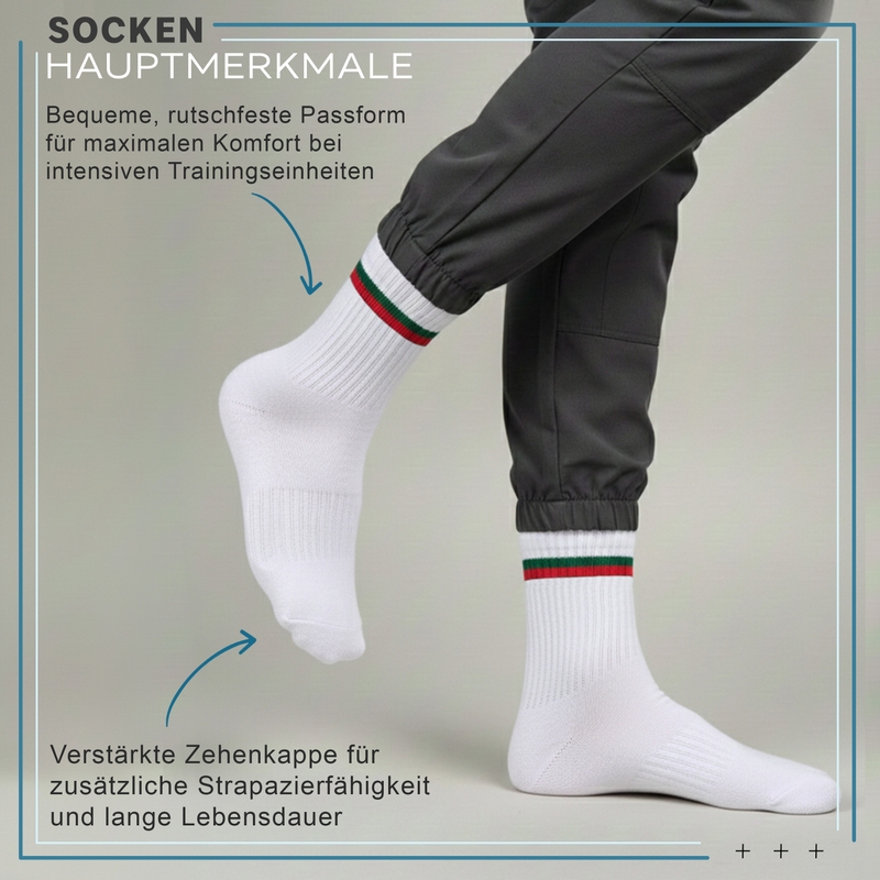 Steigern Sie Ihre Leistung mit unserem 12er-Set Herren Sportsocken mit hohem Schaft, entwickelt für Laufen, Fitness, Wandern und den Alltag. Hergestellt aus hochwertiger, atmungsaktiver Baumwolle, halten diese Socken die Füße trocken, bequem und gut unterstützt bei jeder Aktivität. Die gepolsterte Sohle reduziert die Belastung der Gelenke, während die rutschfeste Passform sich natürlich der Fußform anpasst, Reizungen verhindert und die Stabilität erhöht. Ideal für empfindliche Haut, vereinen diese Socken Weichheit und Langlebigkeit für langanhaltenden Komfort. Mit einem 25 cm langen Schaft bieten diese Herrensportsocken einen sicheren Sitz für Sport und Alltag. Leicht, aber unterstützend, pflegeleicht und langlebig, sind sie erschwinglich, hochwertig und vielseitig einsetzbar. Diese Socken bieten die perfekte Kombination aus Komfort, Funktionalität und Leistung bei jedem Schritt.