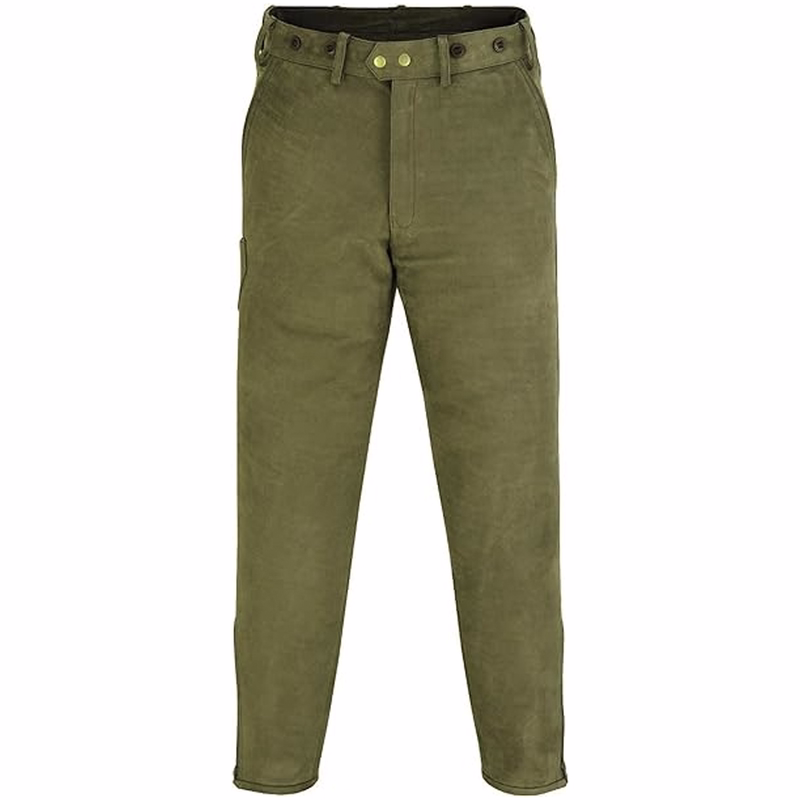 Diese traditionellen deutschen Jagdhosen aus hochwertigem Nubuk- und Büffelleder vereinen Langlebigkeit mit höchstem Tragekomfort. Das lange Schnittmuster in Jagdgrün, Dunkelbraun und Dunkelgrün sorgt für eine effektive Tarnung. Ein feines Polyesterfutter liegt angenehm auf der Haut, während das robuste Nubukleder zuverlässigen Schutz in anspruchsvollem Gelände bietet. Praktische Details wie eine seitliche Messertasche, zwei Vordertaschen sowie eine sichere Gesäßtasche mit Knopfverschluss bieten ausreichend Stauraum. Zierende Knöpfe sowie ein Frontverschluss mit Knopf, Haken und Reißverschluss runden das klassische Design ab.
