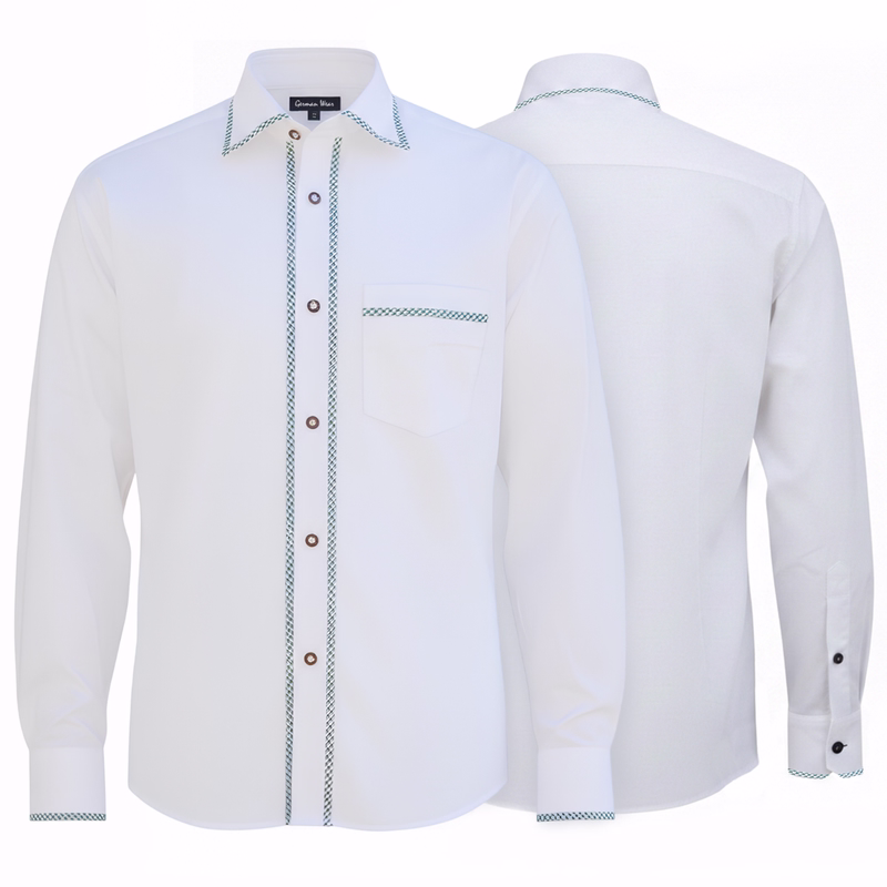 Entdecken Sie das Inbild traditioneller deutscher Mode mit unseren hochwertigen Hemden, die online erhältlich sind. Hergestellt aus 100% weicher Baumwolle, bieten diese weißen Langarmhemden Vielseitigkeit und Komfort. Mit eleganten 2x5 Fältchen, stilvollen Kopfmanschetten und einem klassischen Knopfverschluss sind sie die perfekte Wahl für geschäftliche Anlässe sowie für bayerische Trachtenveranstaltungen.